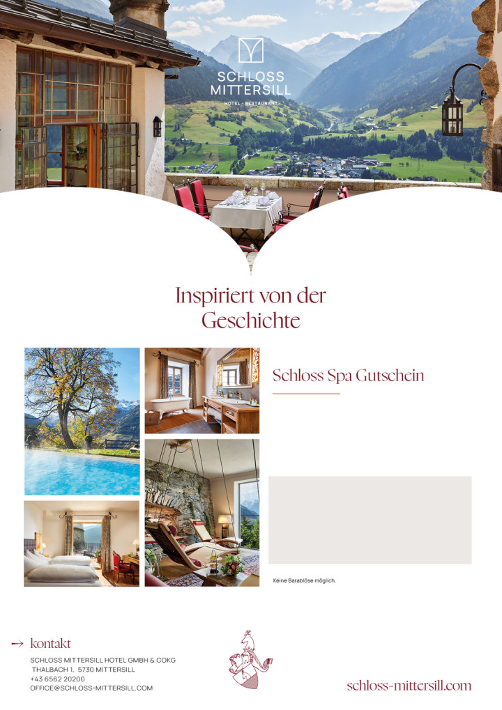 Verschenken Sie unvergleichliche Schloss-Momente in Form einer Übernachtung im Schloss Mittersill. Inkludierte Leistungen: